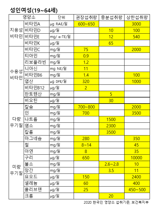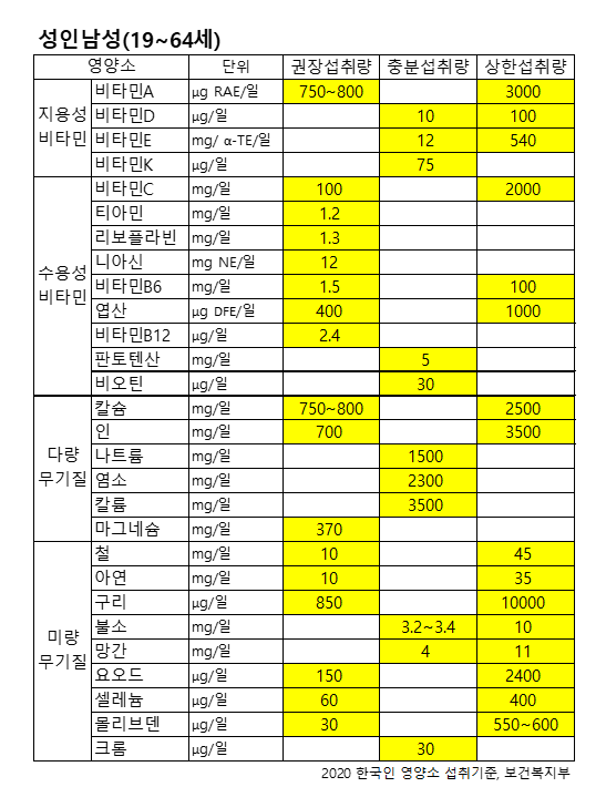 성인 남성과 여성을 기준으로 나누어 정리해 보았으며 지용성비타민, 수용성비타민, 다량무기질, 미량 무기질에 따라 권장섭취량, 충분섭취량, 상한섭취량을 비교해보았습니다.